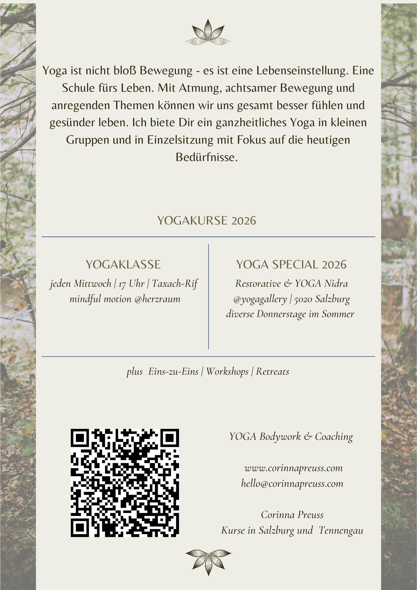 Und manchmal wird es auch stiller. Genau dann, wenn wir gemeinsam in die liebevolle Bewusstheit eintauchen. Beim Meditieren. Im Wald. Beim Yoga Bodywork. Bei einem Gespräch mit Tiefe.